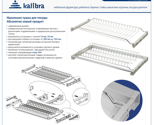 Двухуровневая сушка для посуды KALIBRA предназначена для размещения в прямых верхних шкафах шириной 900 мм. Посудосушитель позволяет максимально использовать внутреннее пространство шкафа, обеспечивая комфортный доступ к содержимому.
