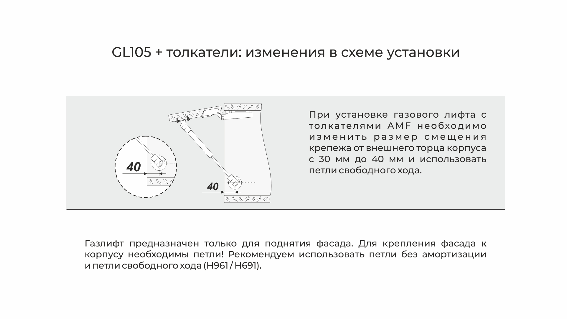 Для открытия от нажатия рекомендуется установка с толкателем (на выбор с AMF 10 по AMF15) и петлями Н961 или Н691. При таком варианте схема монтажа поменяется, необходимо изменить размер смещения крепежа с 30 до 40 мм. Эти изменения отражены в схеме в карусели фото карточки.