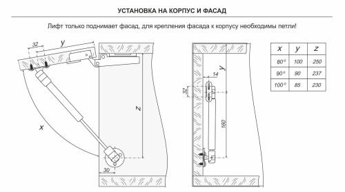 GL105 поставляется в комплекте с двумя кронштейнами – для крепления к боковой стенке корпуса и к фасаду из плитных материалов (ЛДСП/МДФ).