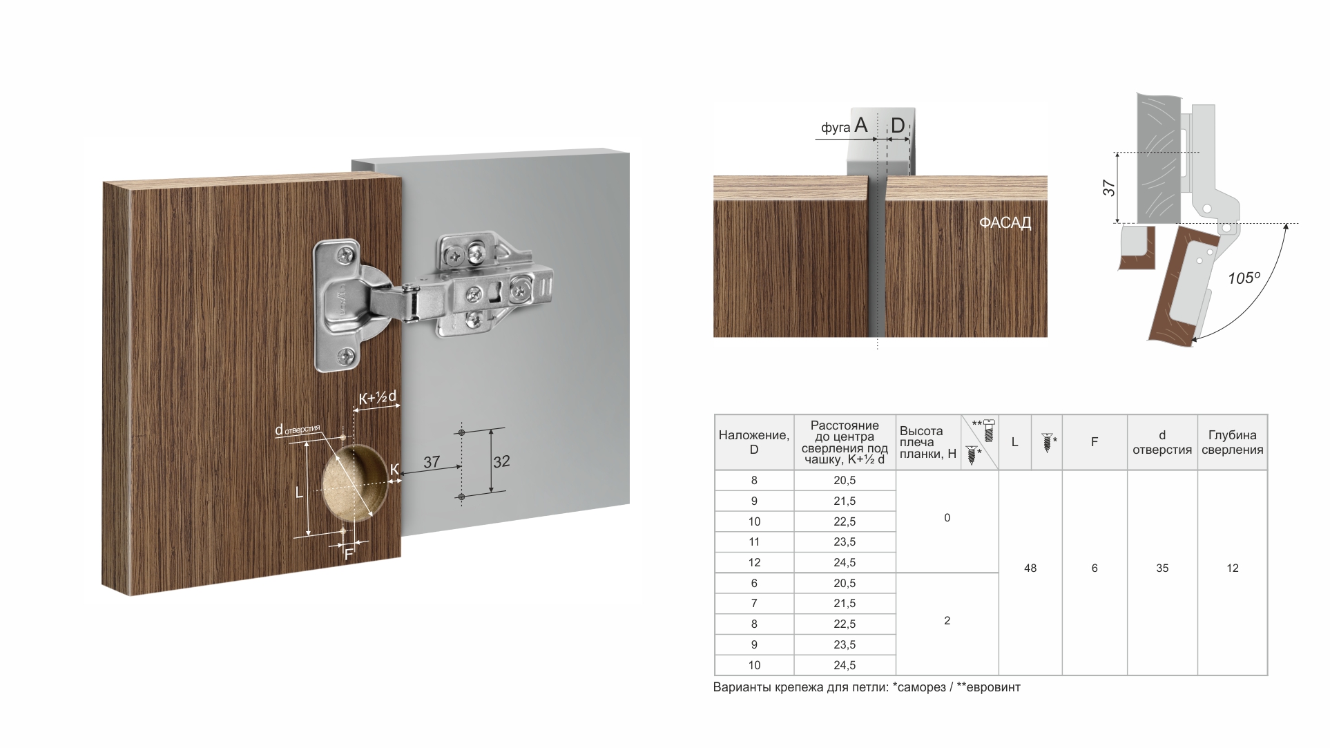 Стильная, удобная петля, с «европейской внешностью» и встроенным в корпус эксцентриковым винтом, который позволяет плавно, в одно действие, отрегулировать глубину положения фасада.