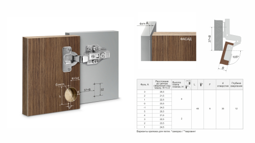 Петля предназначена для надежного крепления вкладных фасадов толщиной до 22 мм. H306 является двухходовой, с возможностью остановки фасада в полуоткрытом положении.