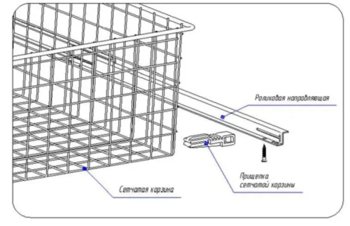 • Комплект прищепок к сотовой корзине (для крепления к направляющим). Прищепки крепятся к направляющим при помощи саморезов и защелкиваются на проволочном каркасе корзины.