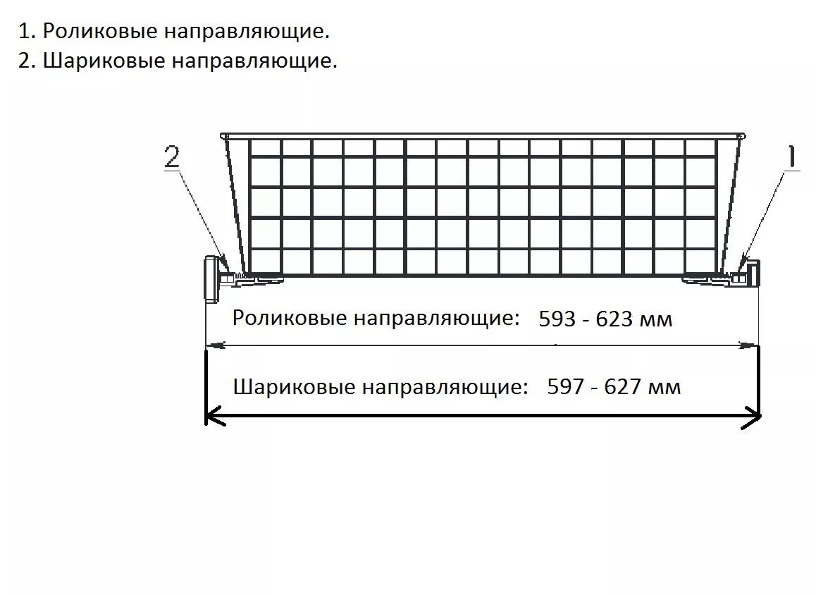 для шариковых направляющих: 597 - 627 мм.