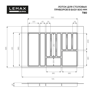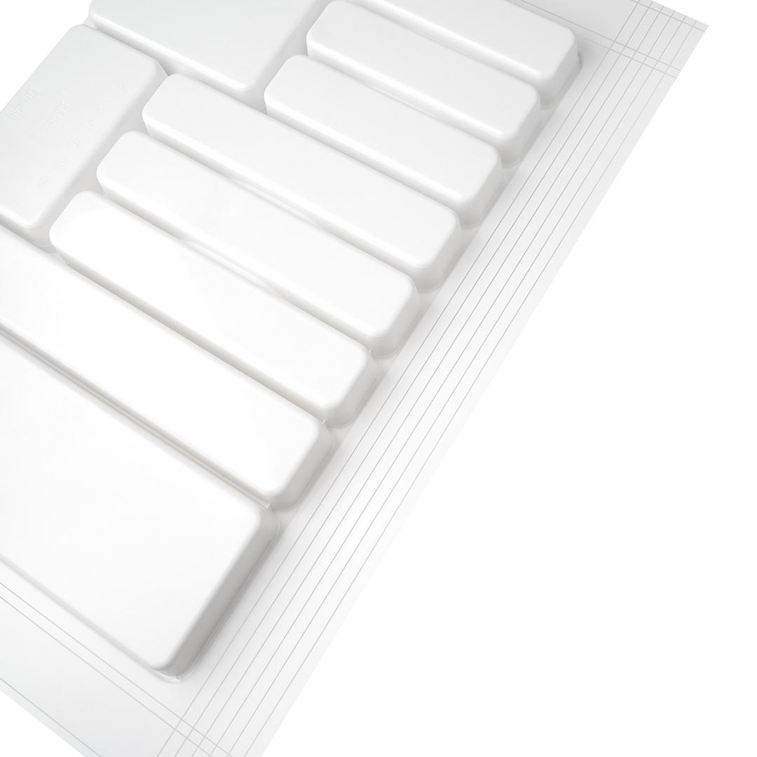 Универсальный обрезной лоток для столовых приборов в ящик корпуса 800мм. Насечки с трех сторон: по ширине разметка 725, 710, 625, 610мм по глубине 424, 434,444, 454,464, 474, 485мм.