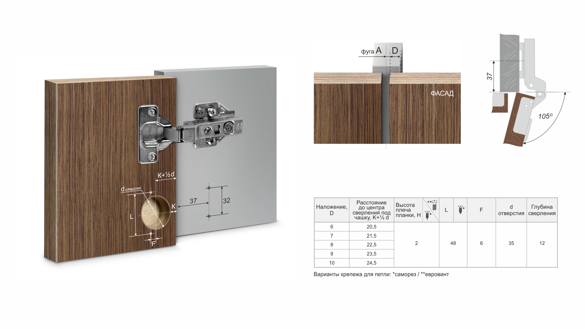 Модель имеет регулировку фасада в трёх плоскостях (по глубине, горизонтали и вертикали). Удобная регулировка по высоте и глубине в одно действие осуществляется при помощи эксцентрикового винта, встроенного в корпус петли. Регулировка фасада по горизонтали доступна при помощи винтов на планке.