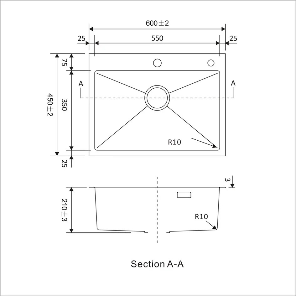 Размеры мойки: 60 × 45 см (длина × ширина).