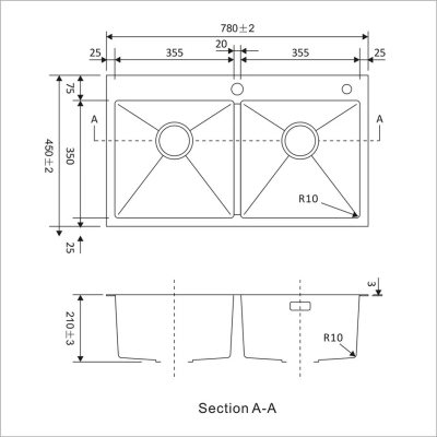 Размер чаш: 35,5 × 35 см каждая — оптимальное пространство для одновременного выполнения разных задач (например, мытья и ополаскивания посуды).