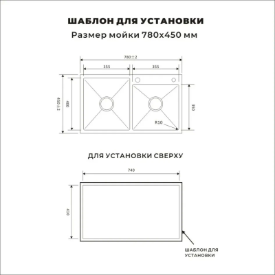 Размеры мойки: 78 × 45 см (длина × ширина).