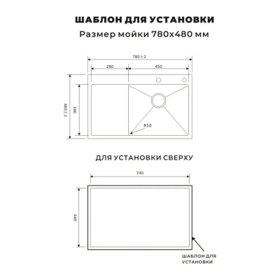 Размеры мойки: 78 × 48 см (длина × ширина).