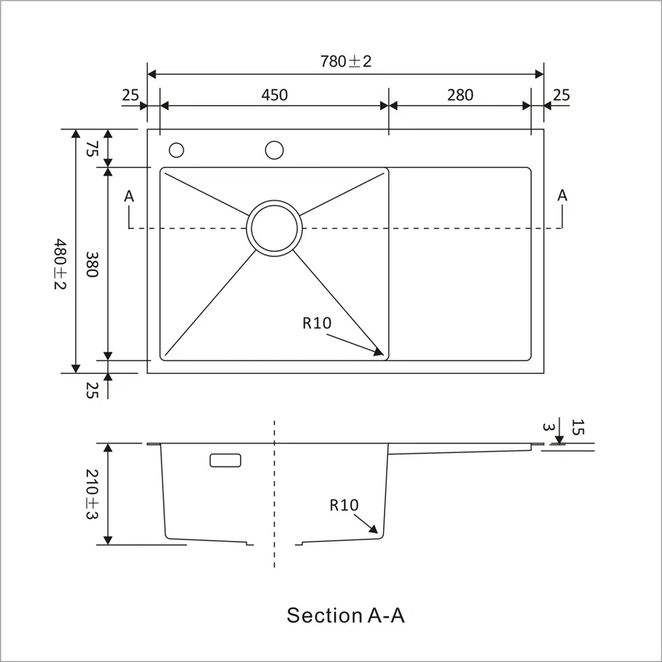 Размеры мойки: 78 × 48 см (длина × ширина).