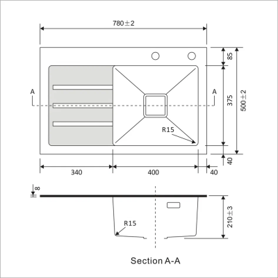 Размер чаши: 40 × 37,5 см — достаточно места для мытья крупной посуды и продуктов.