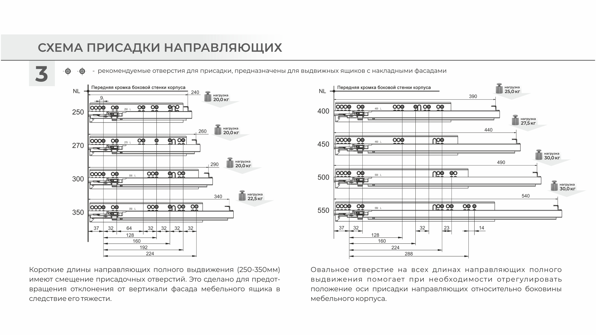 В коротких длинах направляющих DB8781 (250-350 мм) предусмотрено смещение оси присадочных отверстий. Это обеспечивает точное и плотное прилегание фасадов к боковинам мебельного корпуса, даже если неглубокий выдвижной ящик устанавливается с габаритными, высокими фасадами.
