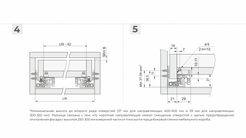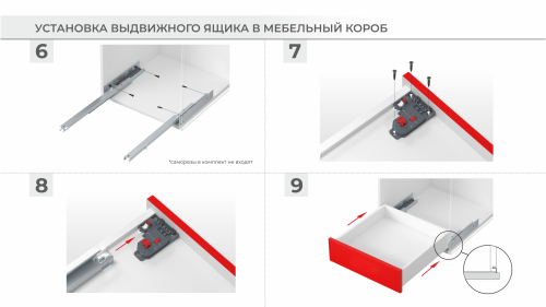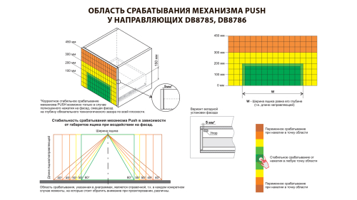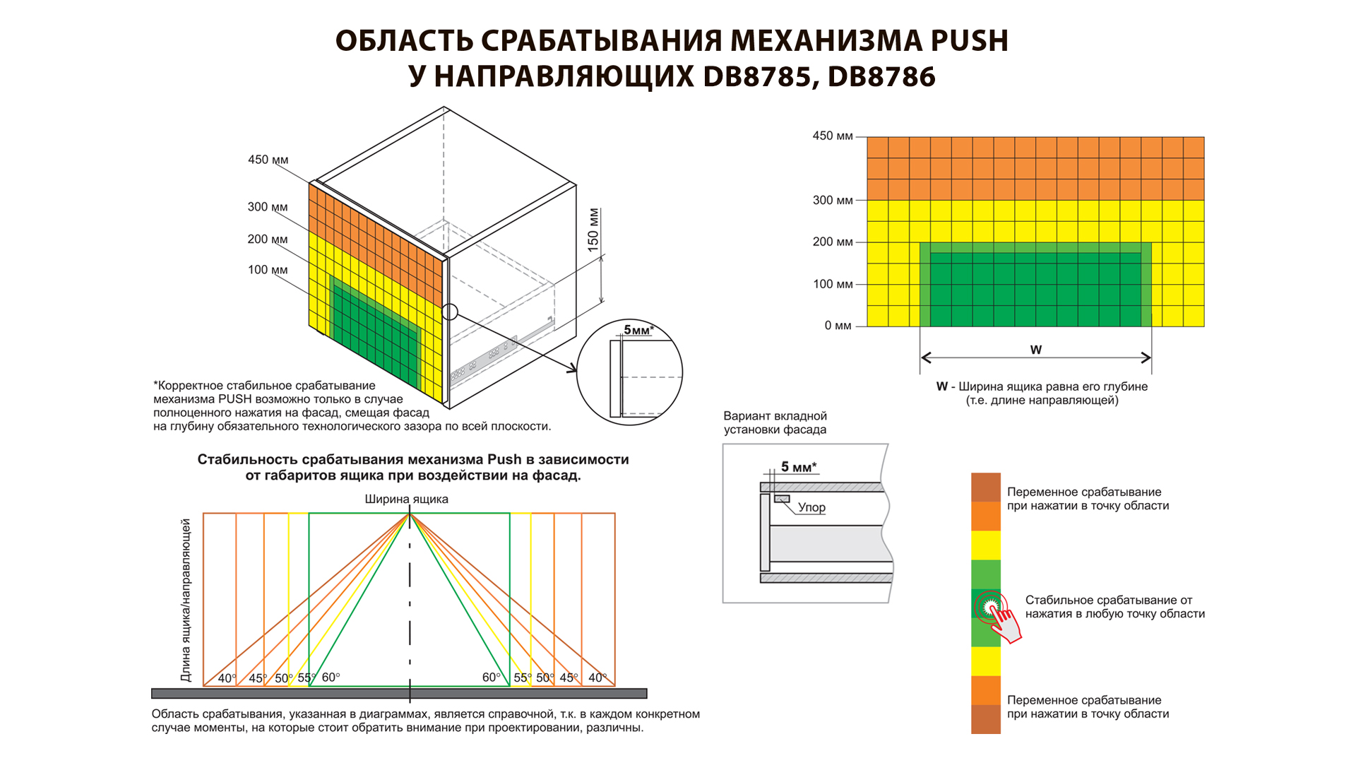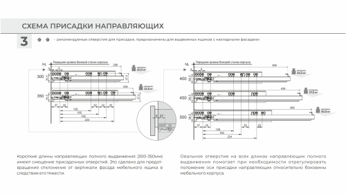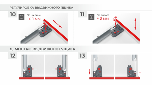 В направляющих предусмотрены дополнительные металлические упоры на подвижной и неподвижной частях направляющих для сдерживания давления в момент установки и в процессе эксплуатации. Это снижает риски излома механизма ПУШ, а также избавляет от необходимости создания дополнительных упоров при создании выдвижных ящиков с вкладным типом фасадов.