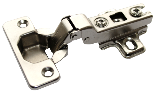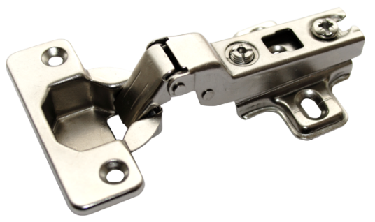 Полунакладная петля предназначена для использования в мебели со смежными дверями, где два фасада крепятся по обе стороны от перегородки шкафа. Петля закрывает половину торца ДСП и соединяет боковую стенку с фасадом под углом 90 градусов.