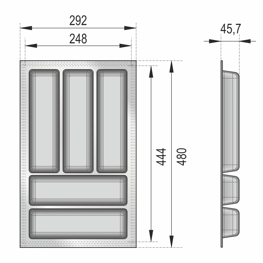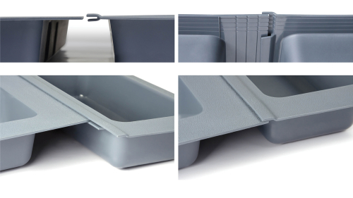 PC14 — многосекционный поддон из экологичного полипропилена, необходим для хранения столовых приборов. Является обязательным образующим элементом для формирования любой комбинации поддонов линейки BLӦKI для выдвижных мебельных ящиков глубиной 500 мм и шириной от 500 мм.