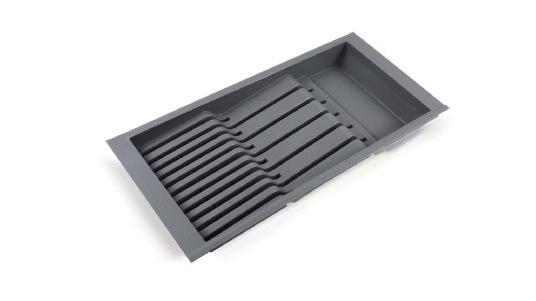 PC15 — поддон из экологичного полипропилена, необходим для хранения ножей разных габаритов. Является составным элементом для формирования индивидуальной комбинации поддонов линейки BLӦKI для выдвижных мебельных ящиков глубиной 450 мм и шириной от 700 мм.