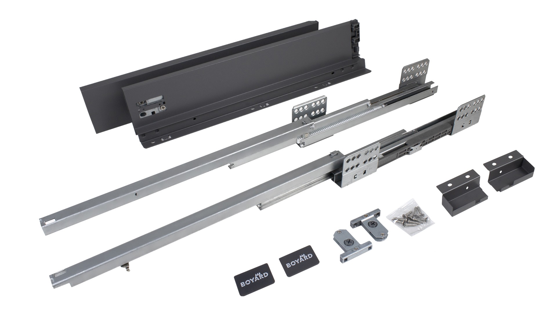 СТАРТ СОФТ SB18 — комплект систем выдвижения для сборки выдвижного мебельного ящика с прямыми боковинами стандартной высоты 86 мм для минимальной высоты проёма 115 мм.