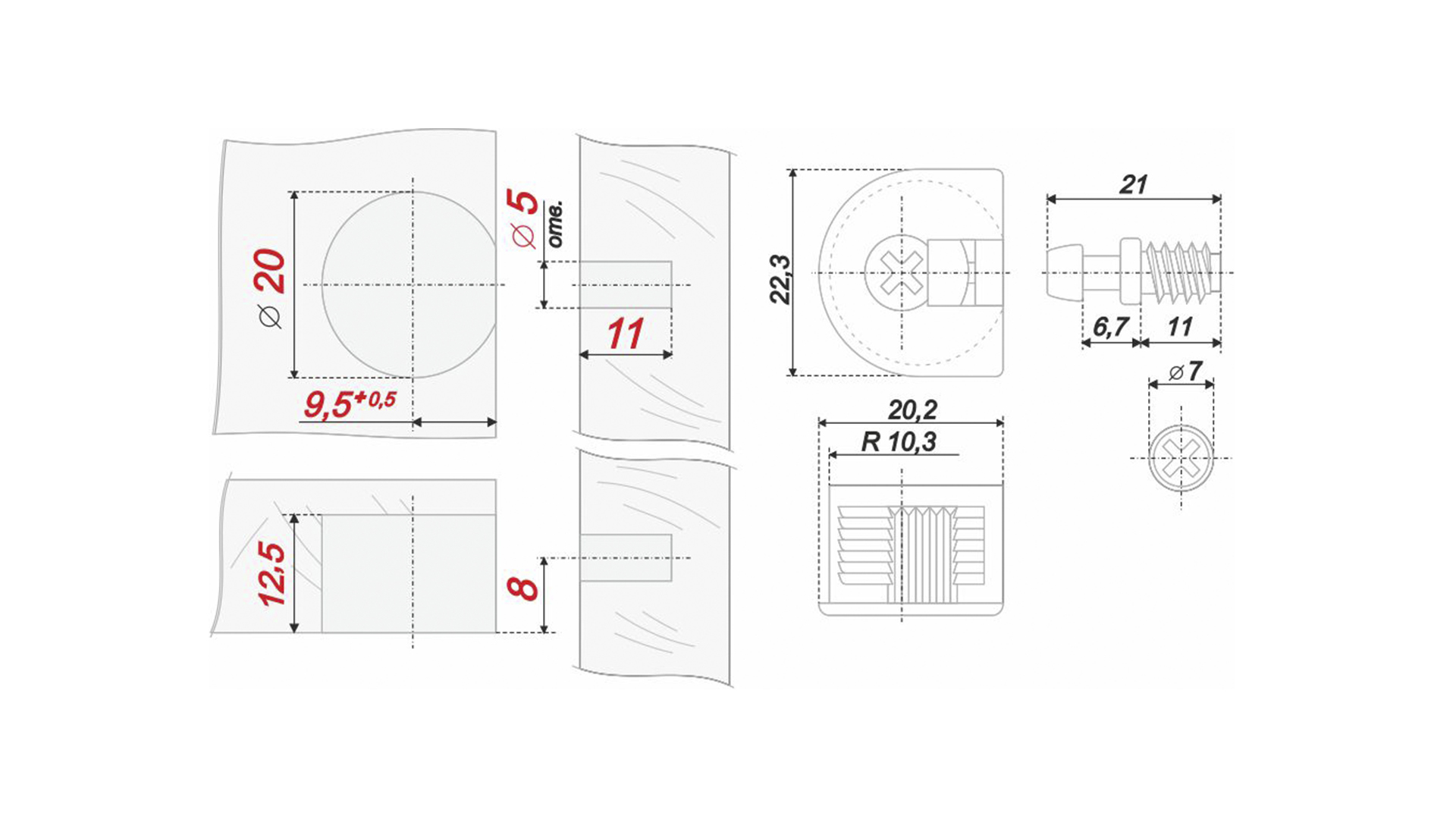 ST01/49 — эксцентриковая стяжка-полкодержатель в пластиковом корпусе. Стяжка состоит из эксцентрика диаметром 20 мм, высотой 12 мм и дюбеля с евро-резьбой. Стяжка предназначена для фиксации деталей мебели толщиной от 16 мм до 22 мм. Особенностью модели является упрощенная сборка: вместо двух отверстий в полке достаточно просверлить одно – для пластиковой основы. Кроме того, стяжка обладает более эстетичным внешним видом, нежели металлические аналоги. Эксцентриковая стяжка ST01/49/3 обеспечивает высокое качество сборки мебели, ее прочность и долговечность.